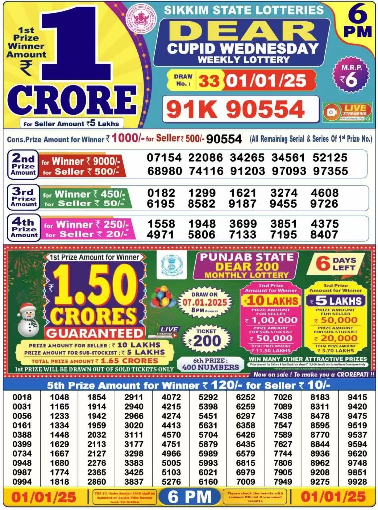 Lottery Sambad Result 1.1.2025 Today 1 PM, 6 PM & 8 PM