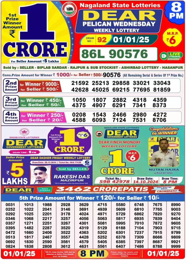 Daily Lottery Sambad Evening Result 8 PM 1/1/2025. Dear Lottery Sambad Evning Result 8 PM live online 1-1-2025. Nagaland Lottery Evening Result 1.1.2025. Lottery Sambad Result 1.1.2025.