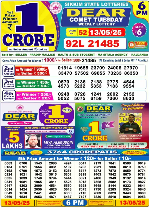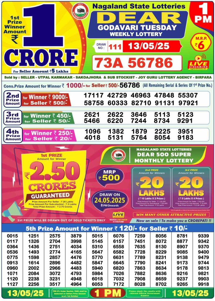 Sambad Lottery Day Result 6 PM 13.5.2025. Free download Nagaland Dear Lottery Sambad 6 PM Day Result Online. Lottery Sambad Day Result 6 PM 13.5.2025.