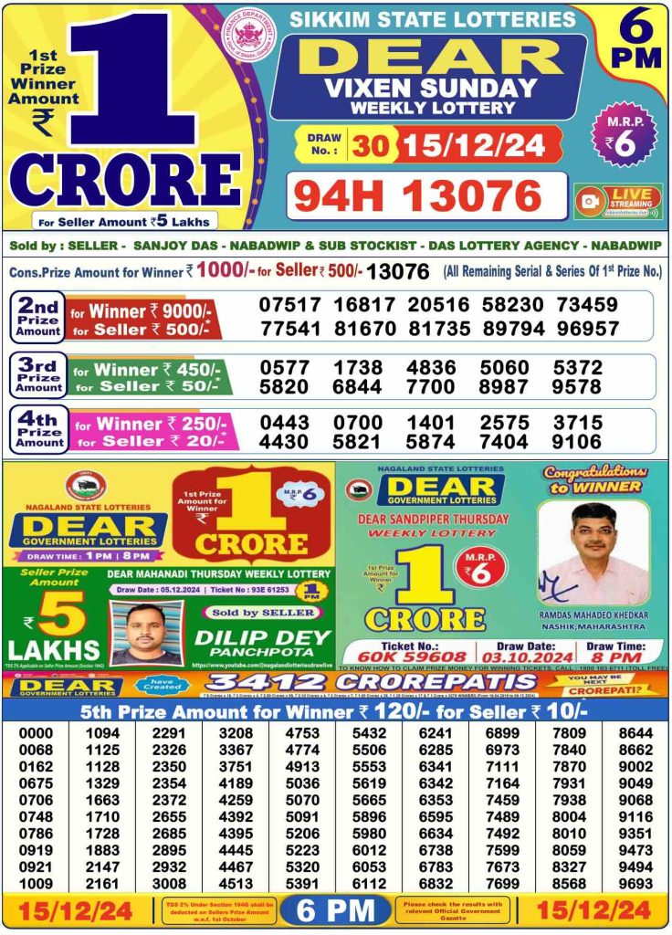 Sambad Lottery Day Result 6 PM 15.12.2024. Free download Nagaland Dear Lottery Sambad 6 PM Day Result Online. Lottery Sambad Day Result 6 PM 15-12-2024.