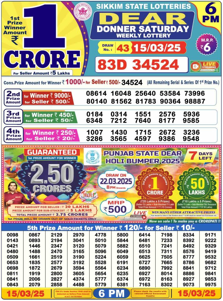 Sambad Lottery Day Result 6 PM 15.3.2025. Free download Nagaland Dear Lottery Sambad 6 PM Day Result Online. Lottery Sambad Day Result 6 PM 15-3-2025.