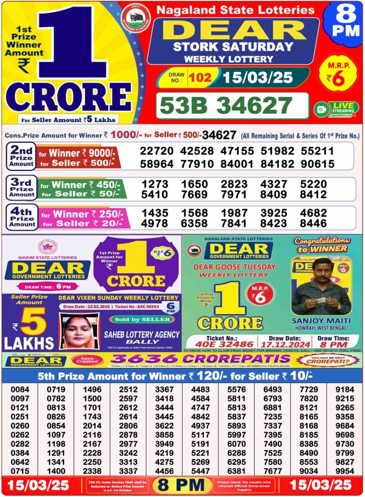 Daily Lottery Sambad Evening Result 8 PM 15/3/2025. Dear Lottery Sambad Evning Result 8 PM live online 15-3-2025. Nagaland Lottery Evening Result 15.3.2025. Lottery Sambad Result 15.3.2025.