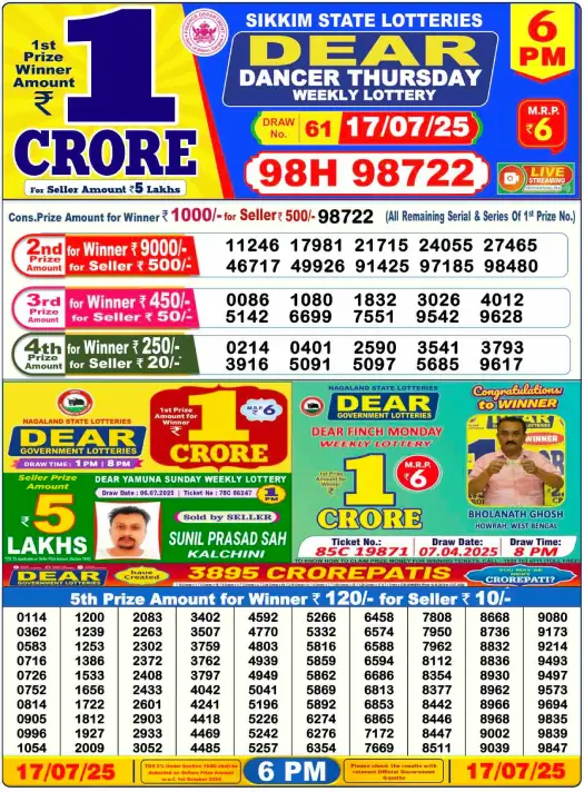 Lottery Sambad Result 17.7.2025 Today 1 PM, 6 PM & 8 PM