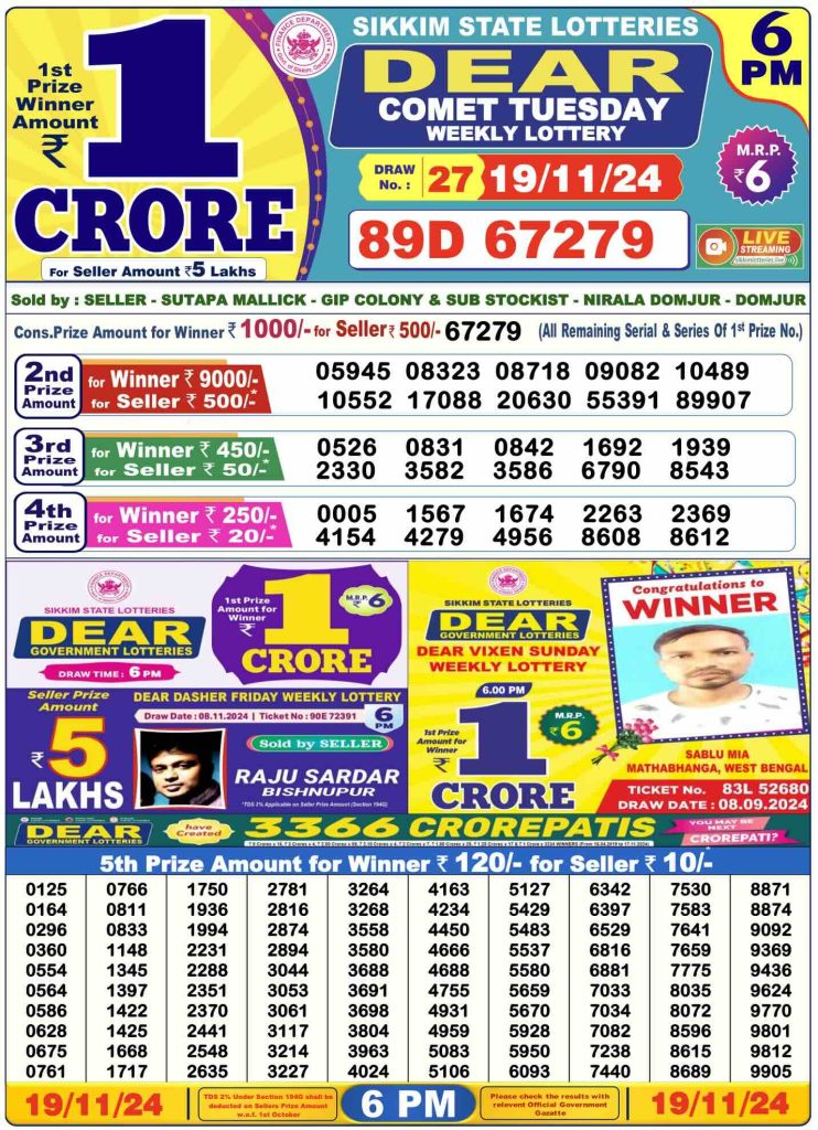 Sambad Lottery Today Result 19-11-2024 (8 PM) |
