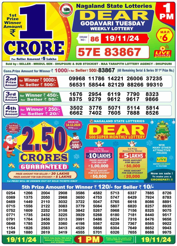 Sambad Lottery Day Result 6 PM 19.11.2024. Free download Nagaland Dear Lottery Sambad 6 PM Day Result Online. Lottery Sambad Day Result 6 PM 19-11-2024.