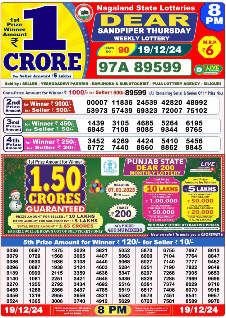 Sambad Lottery Day Result 6 PM 19.12.2024. Free download Nagaland Dear Lottery Sambad 6 PM Day Result Online. Lottery Sambad Day Result 6 PM 19-12-2024.