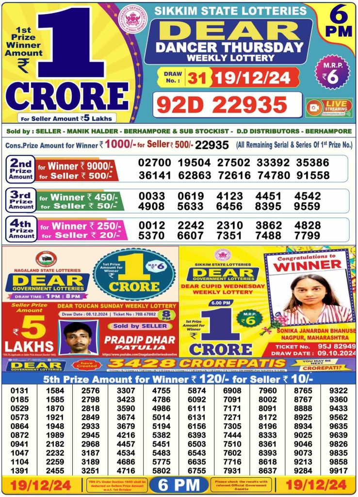 Sambad Lottery Today Result 19-12-2024 (6 PM) |