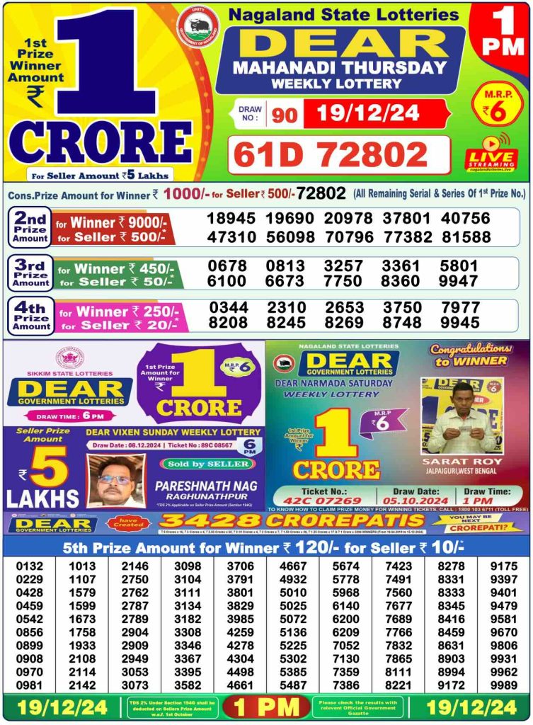 Sambad Lottery Morning Result 1 PM 19-12-2024. Check and free download Dear Lottery Sambad 1 PM Morning Result 19/12/2024. Nagaland Dear Lotery Sambad Result 1 PM 8.1.2023.