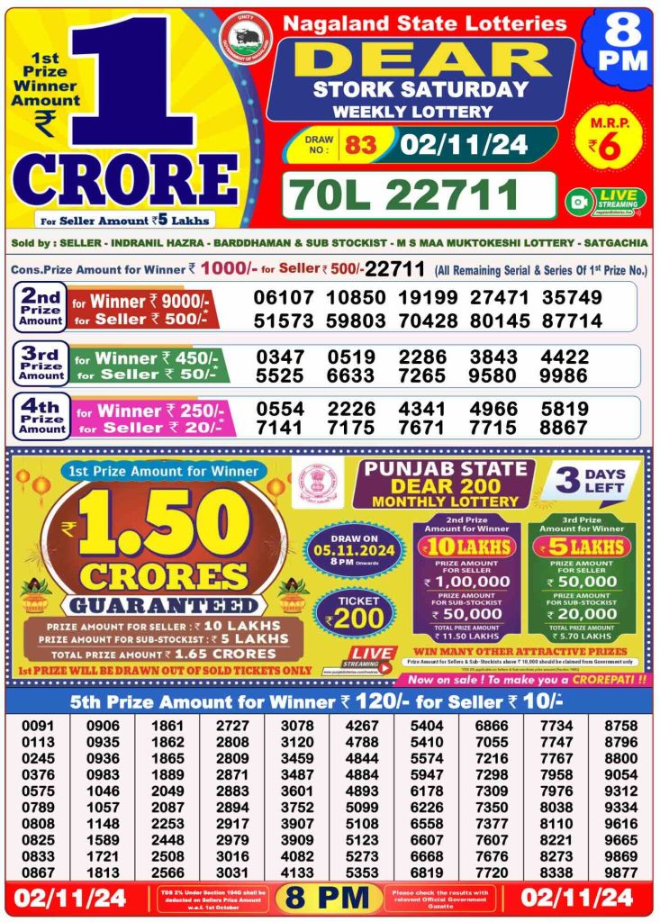 Daily Lottery Sambad Evening Result 8 PM 2/11/2024. Dear Lottery Sambad Evning Result 8 PM live online 2-11-2024. Nagaland Lottery Evening Result 2.11.2024. Lottery Sambad Result 2.11.2024.