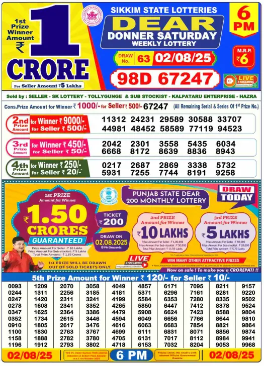 लॉटरी सांबद परिणाम 2.8.2025 दोपहर 1 बजे सुबह का परिणाम, शाम 6 बजे दिन का परिणाम और रात 8 बजे शाम का परिणाम देखें और मुफ्त डाउनलोड करें
