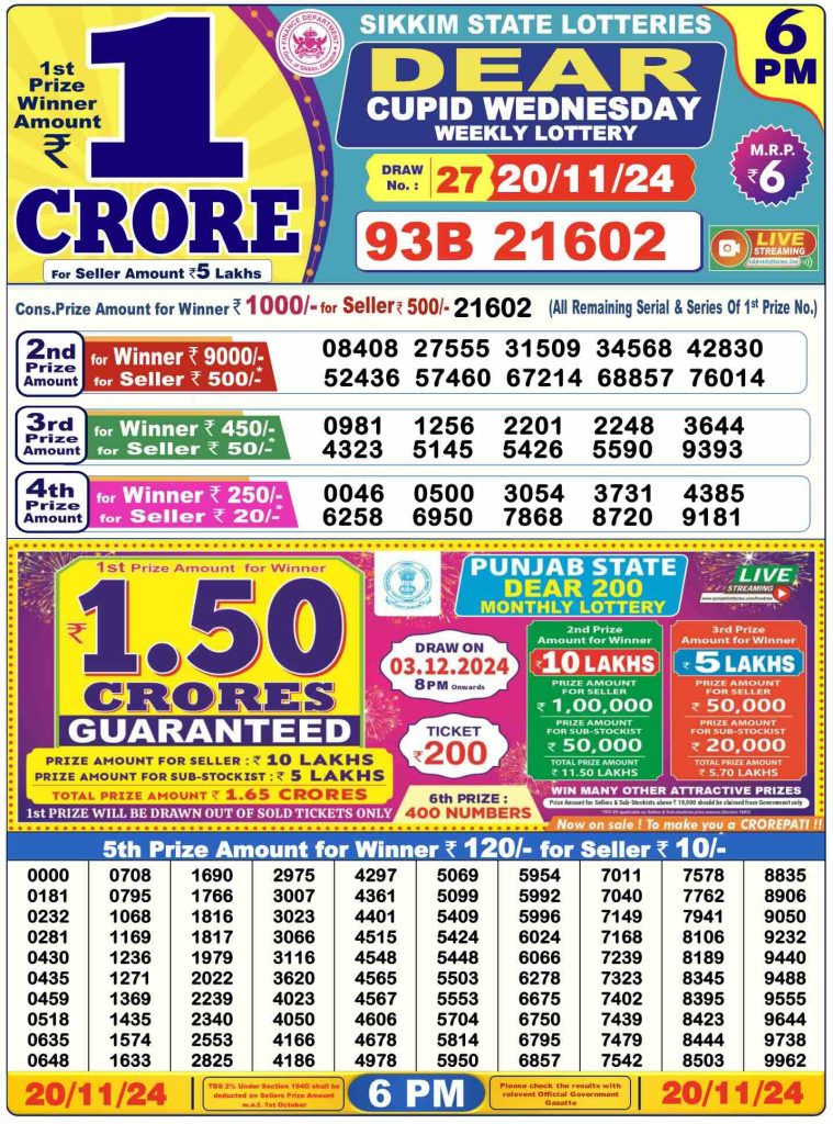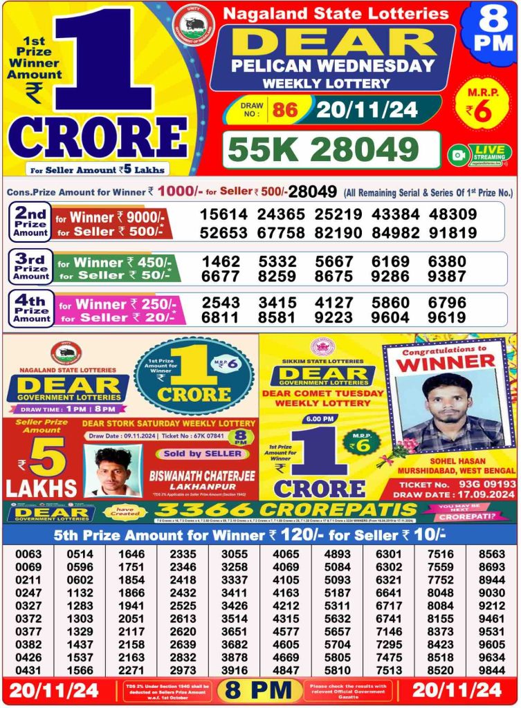 Sambad Lottery Day Result 6 PM 20.11.2024. Free download Nagaland Dear Lottery Sambad 6 PM Day Result Online. Lottery Sambad Day Result 6 PM 20-11-2024.