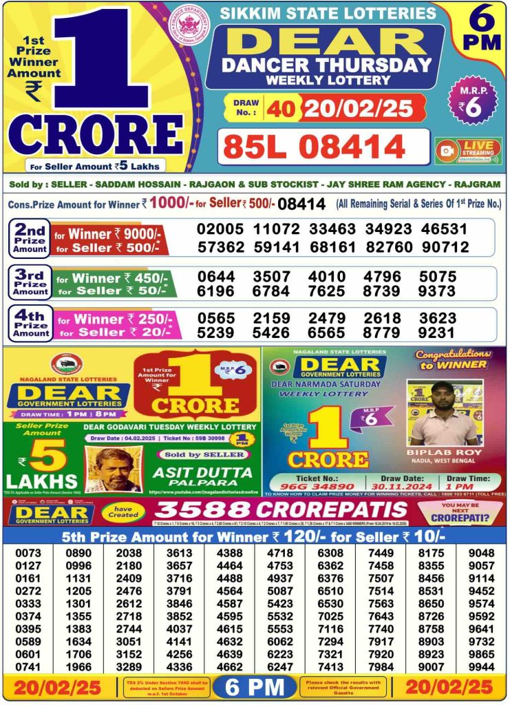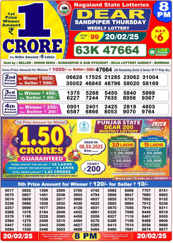 Sambad Lottery Day Result 6 PM 20.2.2025. Free download Nagaland Dear Lottery Sambad 6 PM Day Result Online. Lottery Sambad Day Result 6 PM 20-2-2025.
