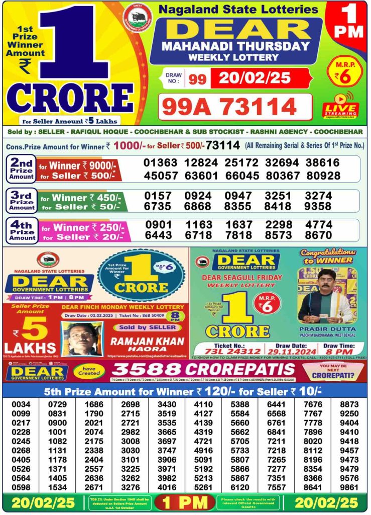Sambad Lottery Morning Result 1 PM 20-2-2025. Check and free download Dear Lottery Sambad 1 PM Morning Result 20/2/2025. Nagaland Dear Lotery Sambad Result 1 PM 8.1.2023.
