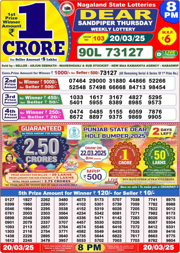 Sambad Lottery Day Result 6 PM 20.3.2025. Free download Nagaland Dear Lottery Sambad 6 PM Day Result Online. Lottery Sambad Day Result 6 PM 20-3-2025.