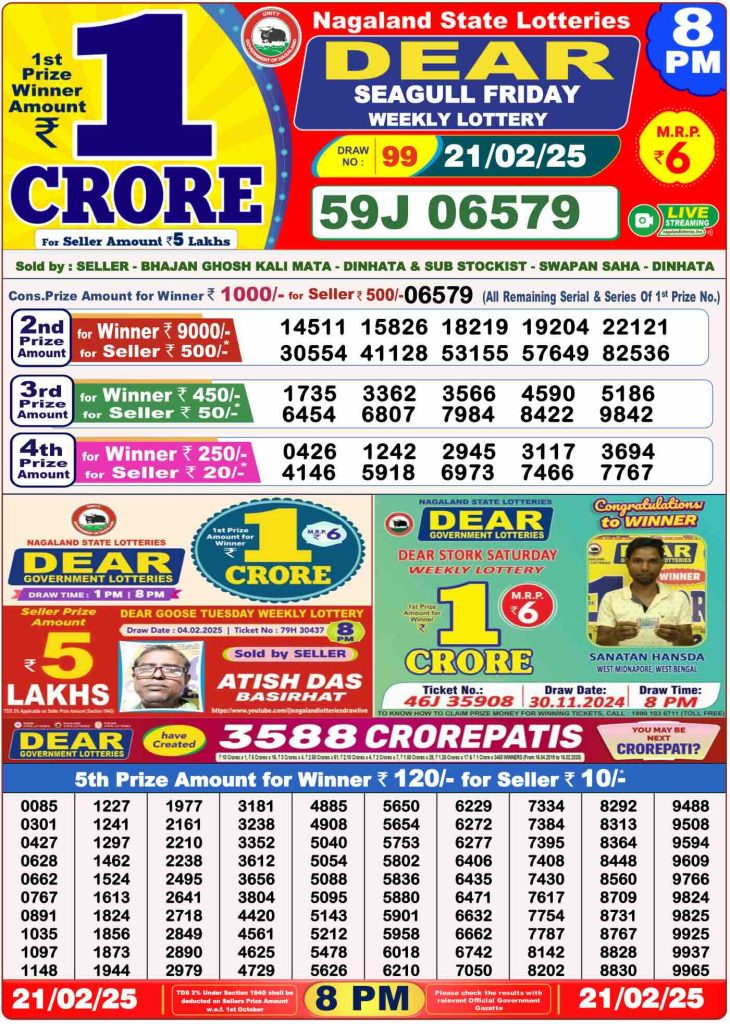 Daily Lottery Sambad Evening Result 8 PM 21/2/2025. Dear Lottery Sambad Evning Result 8 PM live online 21-2-2025. Nagaland Lottery Evening Result 21.2.2025. Lottery Sambad Result 21.2.2025.