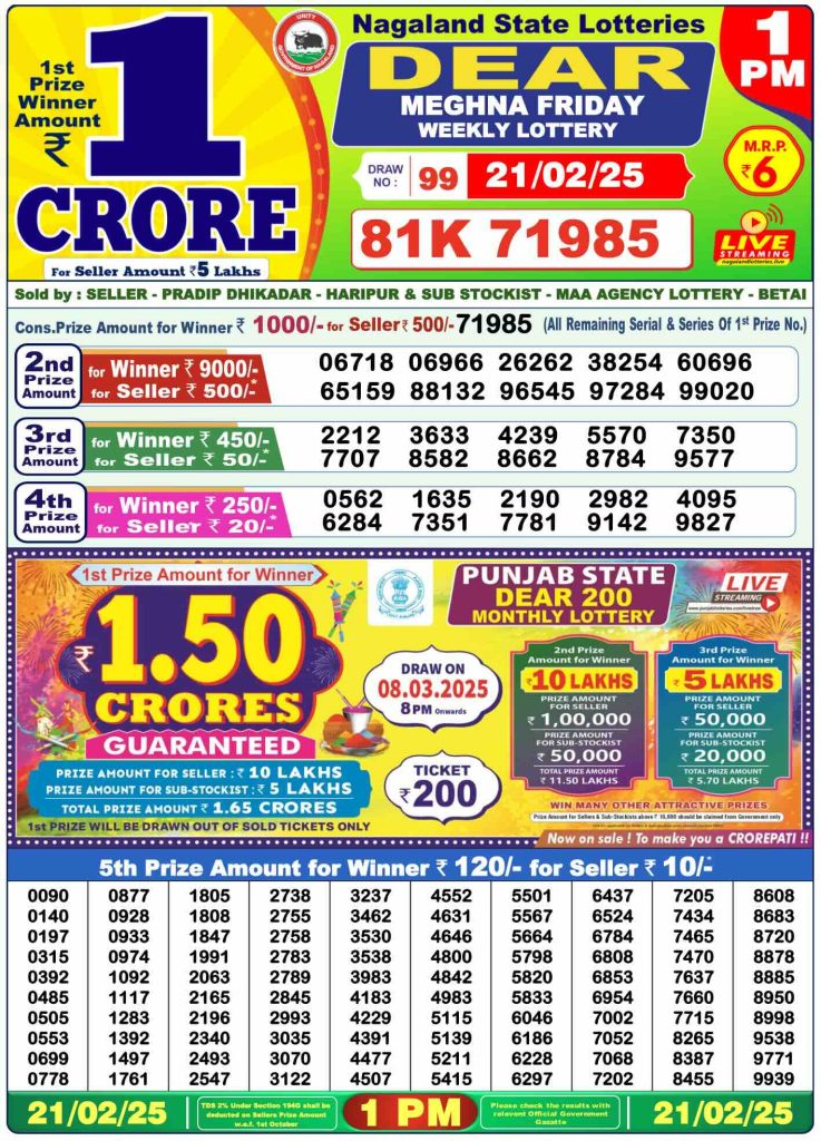 Sambad Lottery Morning Result 1 PM 21-2-2025. Check and free download Dear Lottery Sambad 1 PM Morning Result 21/2/2025. Nagaland Dear Lotery Sambad Result 1 PM 8.1.2023.