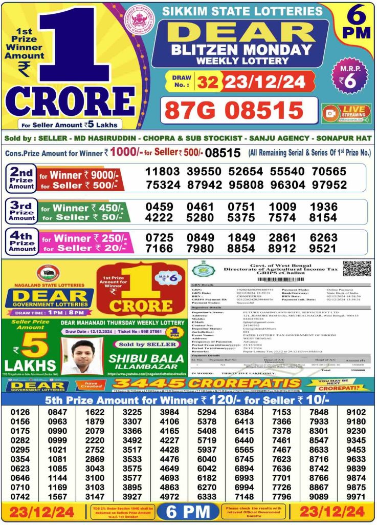 Daily Lottery Sambad Evening Result 8 PM 23/12/2024. Dear Lottery Sambad Evning Result 8 PM live online 23-12-2024. Nagaland Lottery Evening Result 23.12.2024. Lottery Sambad Result 23.12.2024.
