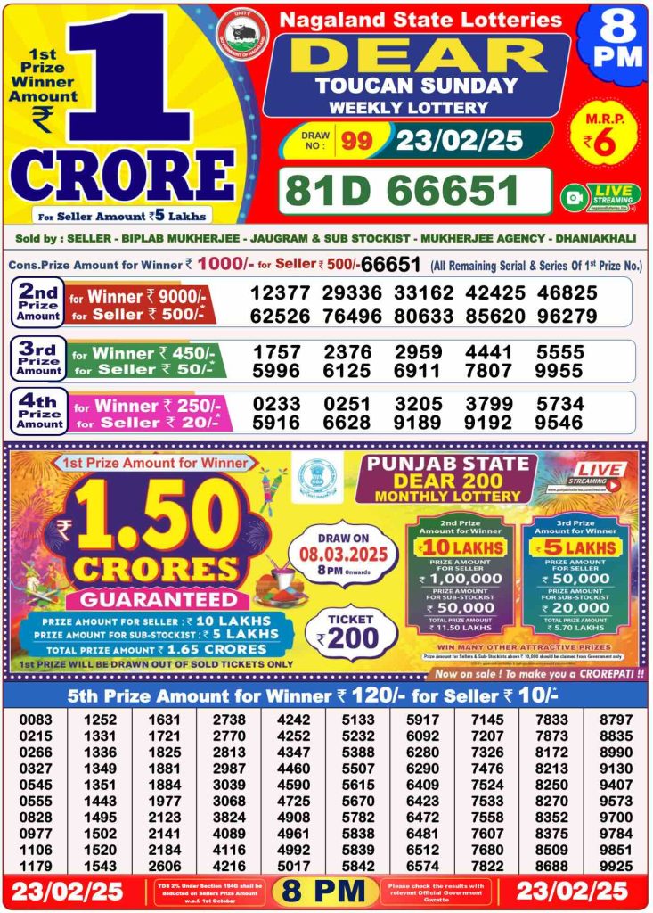 Daily Lottery Sambad Evening Result 8 PM 23/2/2025. Dear Lottery Sambad Evning Result 8 PM live online 23-2-2025. Nagaland Lottery Evening Result 23.2.2025. Lottery Sambad Result 23.2.2025.