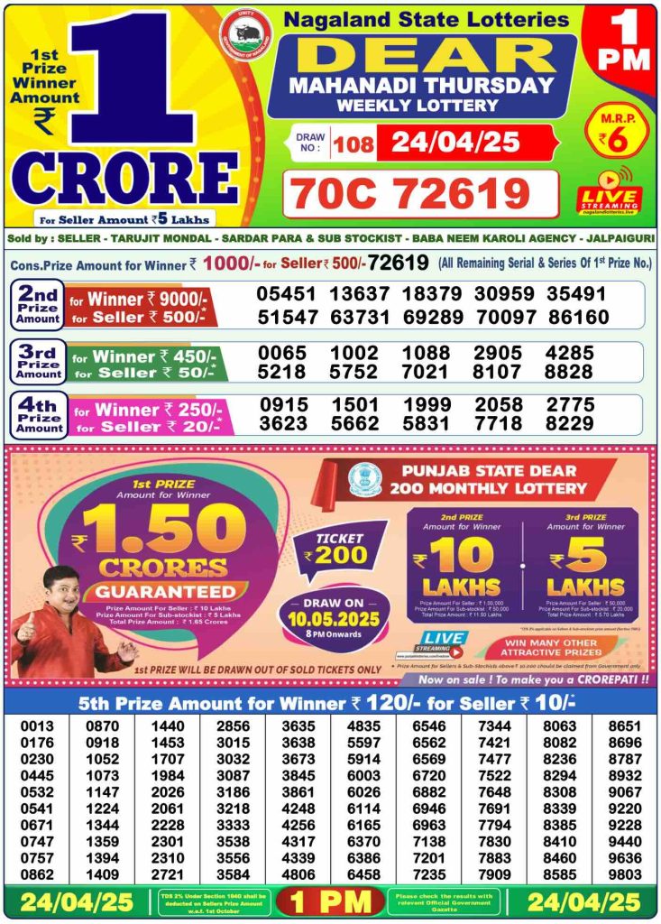 Sambad Lottery Morning Result 1 PM 24-4-2025. Check and free download Dear Lottery Sambad 1 PM Morning Result 24/4/2025. Nagaland Dear Lotery Sambad Result 1 PM 8.1.2023.