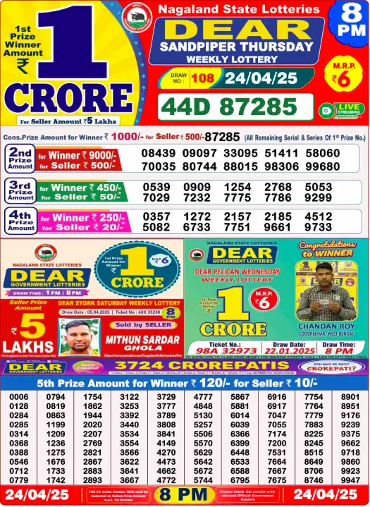 Daily Lottery Sambad Evening Result 8 PM 24/4/2025. Dear Lottery Sambad Evning Result 8 PM live online 24-4-2025. Nagaland Lottery Evening Result 24.4.2025. Lottery Sambad Result 24.4.2025.