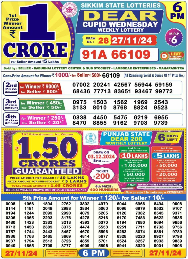 Sambad Lottery Today Result 27-11-2024 (6 PM) |