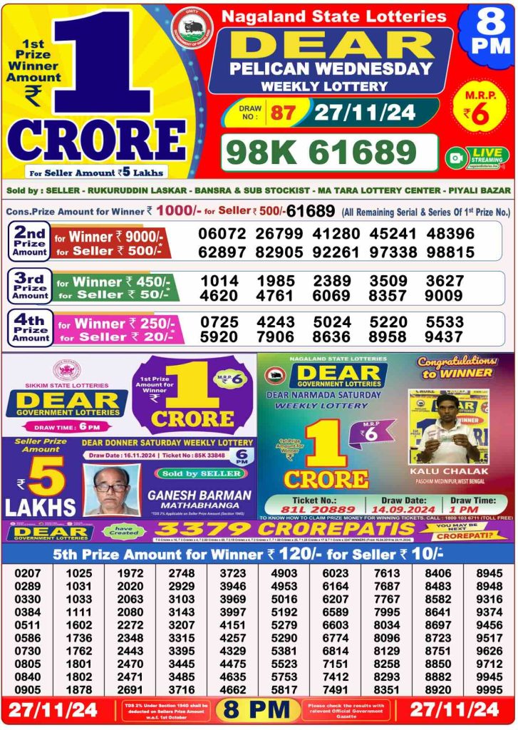 Lottery Sambad Result 27.11.2024 Today 1 PM, 6 PM & 8 PM