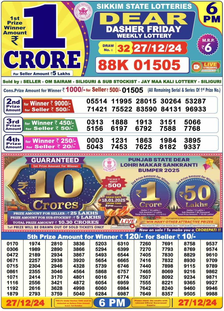 Sambad Lottery Today Result 27-12-2024 (6 PM) |