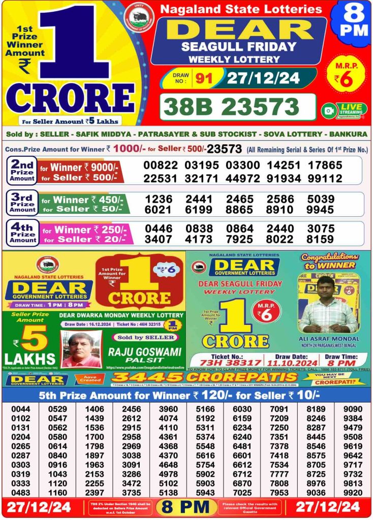 Sambad Lottery Day Result 6 PM 27.12.2024. Free download Nagaland Dear Lottery Sambad 6 PM Day Result Online. Lottery Sambad Day Result 6 PM 27-12-2024.