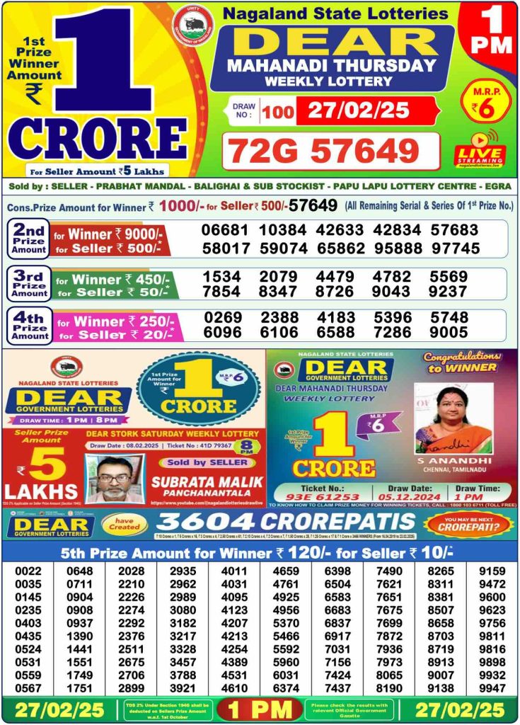 Sambad Lottery Morning Result 1 PM 27-2-2025. Check and free download Dear Lottery Sambad 1 PM Morning Result 27/2/2025. Nagaland Dear Lotery Sambad Result 1 PM 8.1.2023.