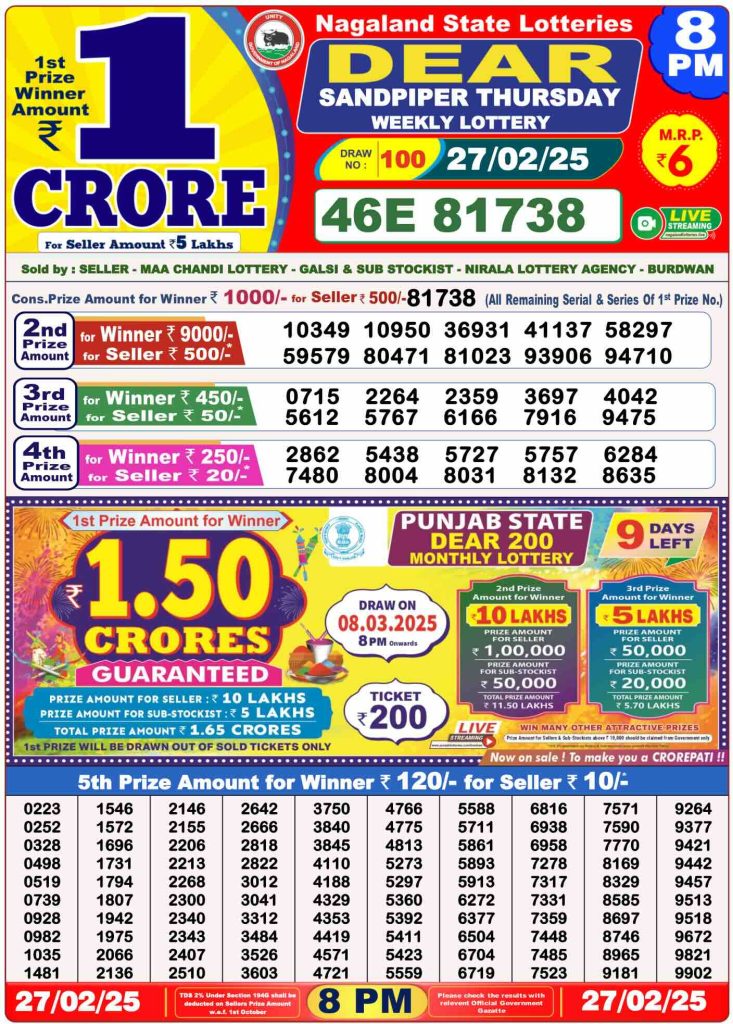 Sambad Lottery Day Result 6 PM 27.2.2025. Free download Nagaland Dear Lottery Sambad 6 PM Day Result Online. Lottery Sambad Day Result 6 PM 27-2-2025.