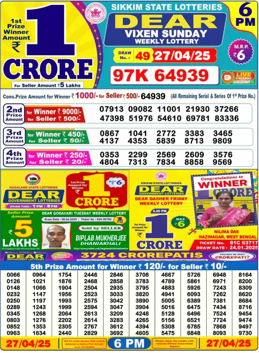 Sambad Lottery Day Result 6 PM 27.4.2025. Free download Nagaland Dear Lottery Sambad 6 PM Day Result Online. Lottery Sambad Day Result 6 PM 27-4-2025.