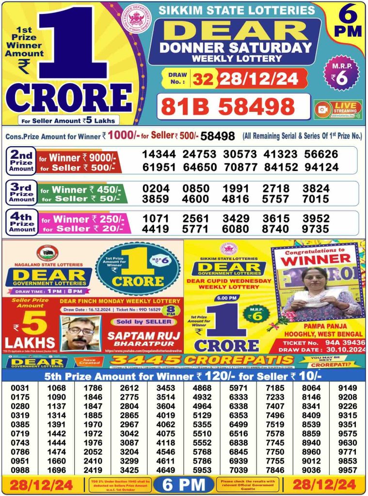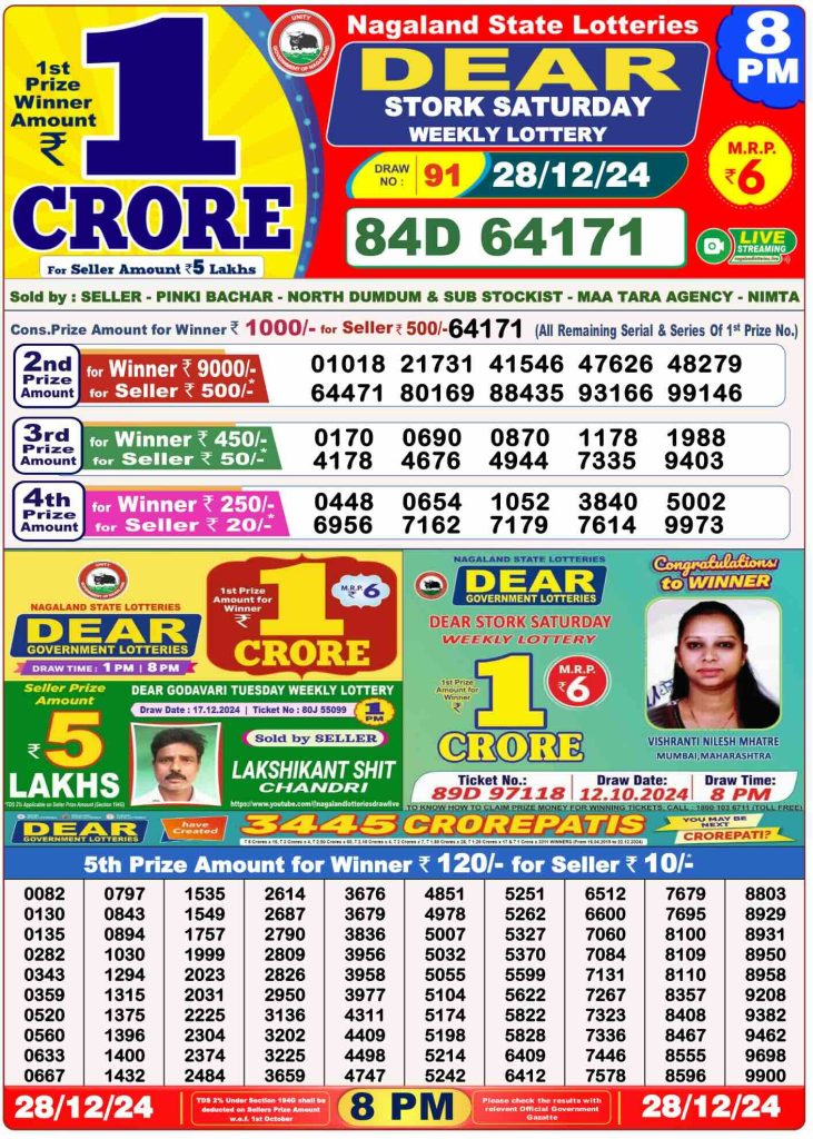 Sambad Lottery Day Result 6 PM 28.12.2024. Free download Nagaland Dear Lottery Sambad 6 PM Day Result Online. Lottery Sambad Day Result 6 PM 28-12-2024.