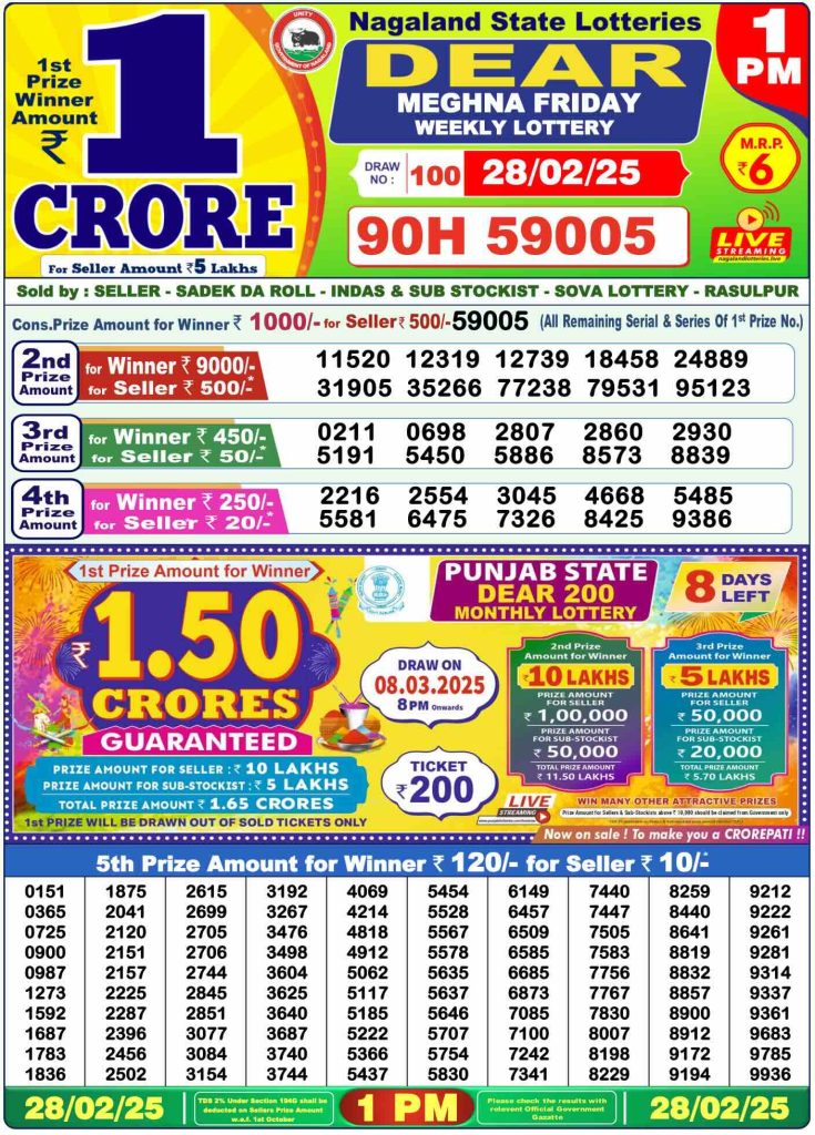 Sambad Lottery Morning Result 1 PM 28-2-2025. Check and free download Dear Lottery Sambad 1 PM Morning Result 28/2/2025. Nagaland Dear Lotery Sambad Result 1 PM 8.1.2023.