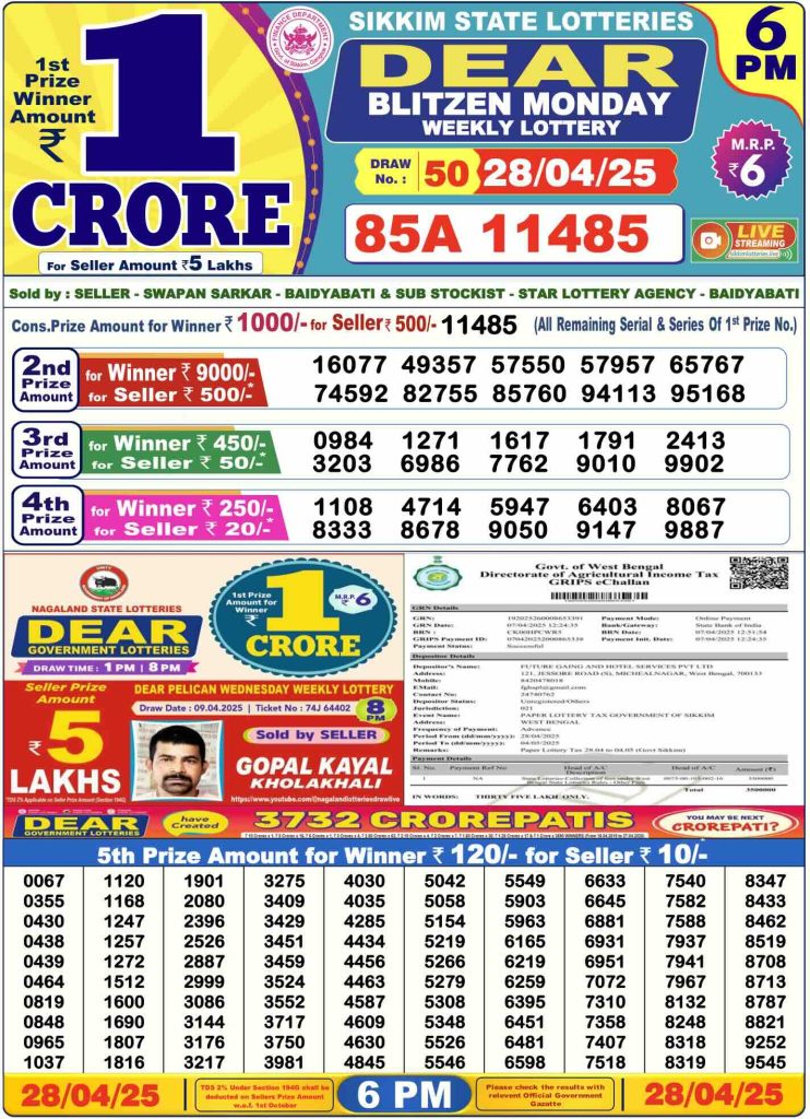 Sambad Lottery Day Result 6 PM 28.4.2025. Free download Nagaland Dear Lottery Sambad 6 PM Day Result Online. Lottery Sambad Day Result 6 PM 28-4-2025.