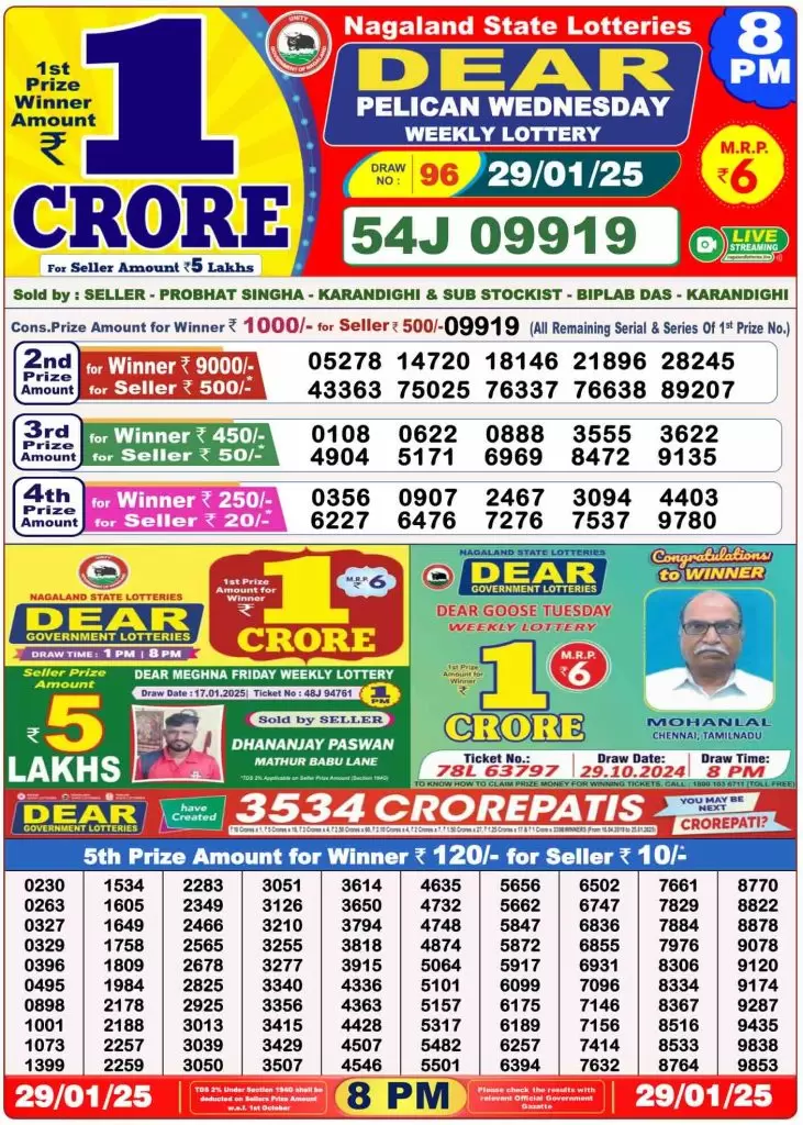 Daily Lottery Sambad Evening Result 8 PM 29/1/2025. Dear Lottery Sambad Evning Result 8 PM live online 29-1-2025. Nagaland Lottery Evening Result 29.1.2025. Lottery Sambad Result 29.1.2025.