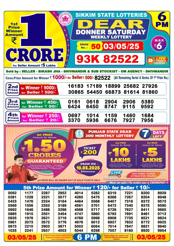 लॉटरी सांबद परिणाम 3.5.2025 दोपहर 1 बजे सुबह का परिणाम, शाम 6 बजे दिन का परिणाम और रात 8 बजे शाम का परिणाम देखें और मुफ्त डाउनलोड करें