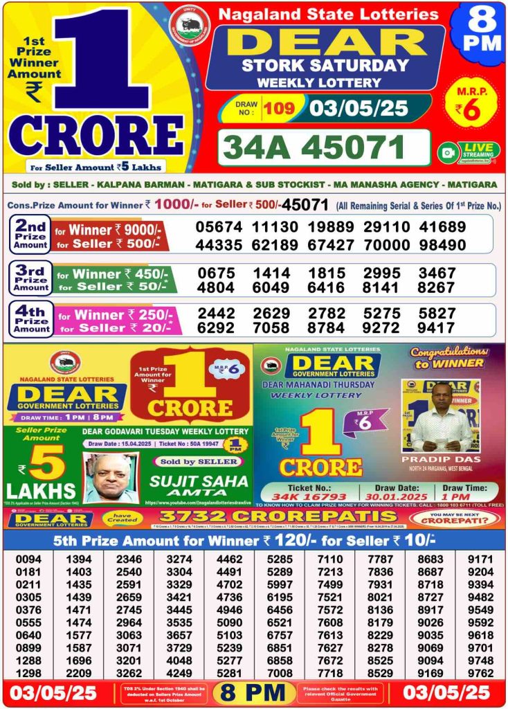Daily Lottery Sambad Evening Result 8 PM 3/5/2025. Dear Lottery Sambad Evning Result 8 PM live online 3-5-2025. Nagaland Lottery Evening Result 3.5.2025. Lottery Sambad Result 3.5.2025.