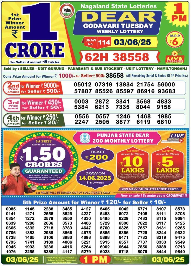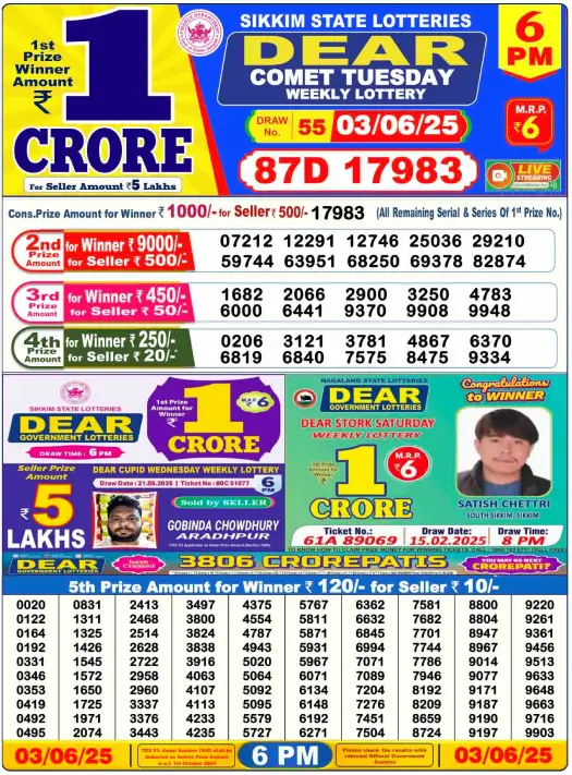 Lottery Sambad Result 3.6.2025 Today 1 PM, 6 PM & 8 PM