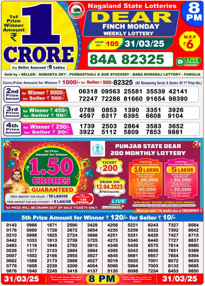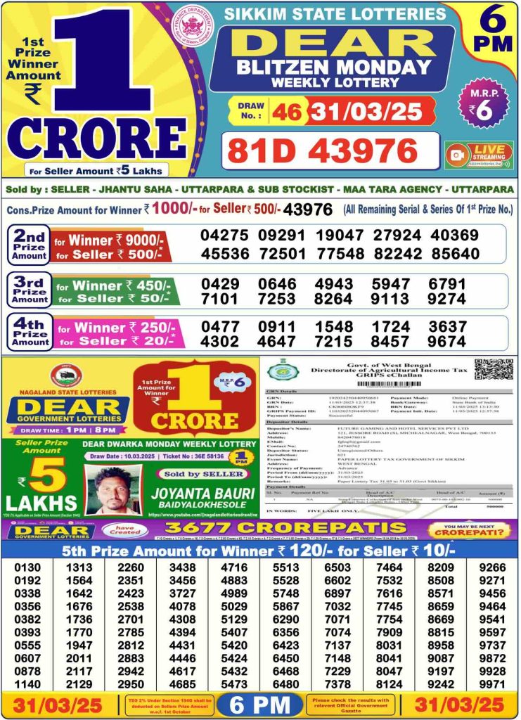 Sambad Lottery Day Result 6 PM 31.3.2025. Free download Nagaland Dear Lottery Sambad 6 PM Day Result Online. Lottery Sambad Day Result 6 PM 31-3-2025.
