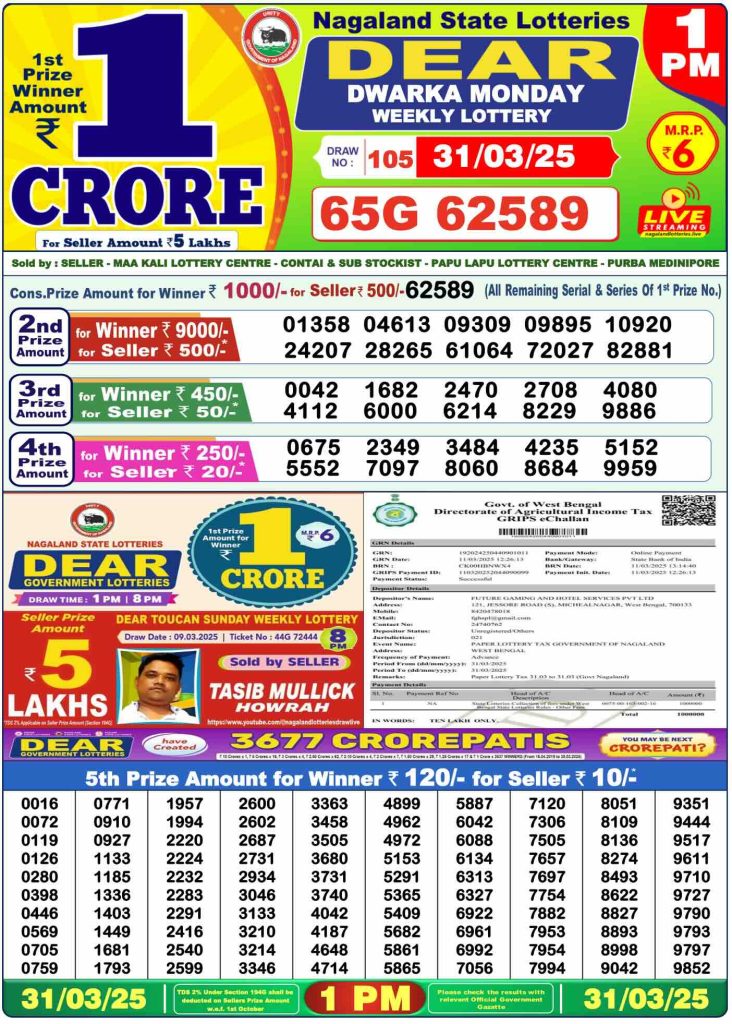 Sambad Lottery Morning Result 1 PM 31-3-2025. Check and free download Dear Lottery Sambad 1 PM Morning Result 31/3/2025. Nagaland Dear Lotery Sambad Result 1 PM 8.1.2023.