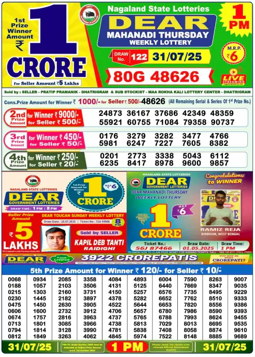 Sambad Lottery Morning Result 1 PM 31.7.2025. Check and free download Dear Lottery Sambad 1 PM Morning Result 31/7/2025. Nagaland Dear Lotery Sambad Result 1 PM 8.1.2023.