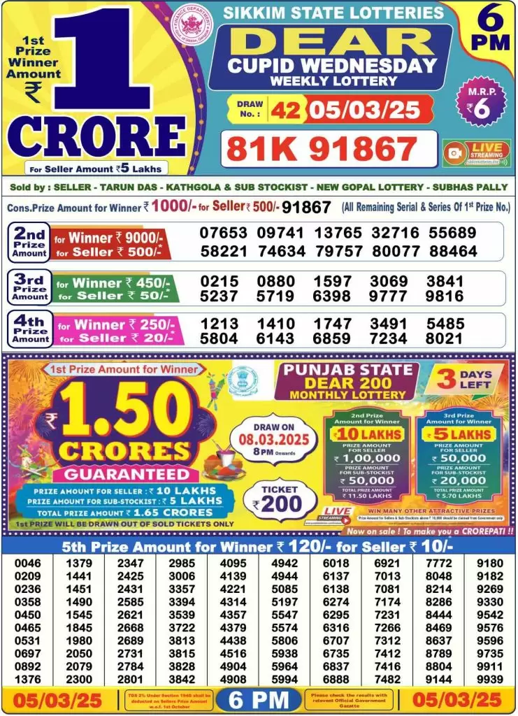 Dear Lottery Sambad Today Result 6 PM