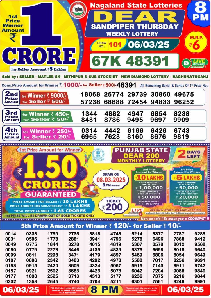 Daily Lottery Sambad Evening Result 8 PM 6/3/2025. Dear Lottery Sambad Evning Result 8 PM live online 6-3-2025. Nagaland Lottery Evening Result 6.3.2025. Lottery Sambad Result 6.3.2025.