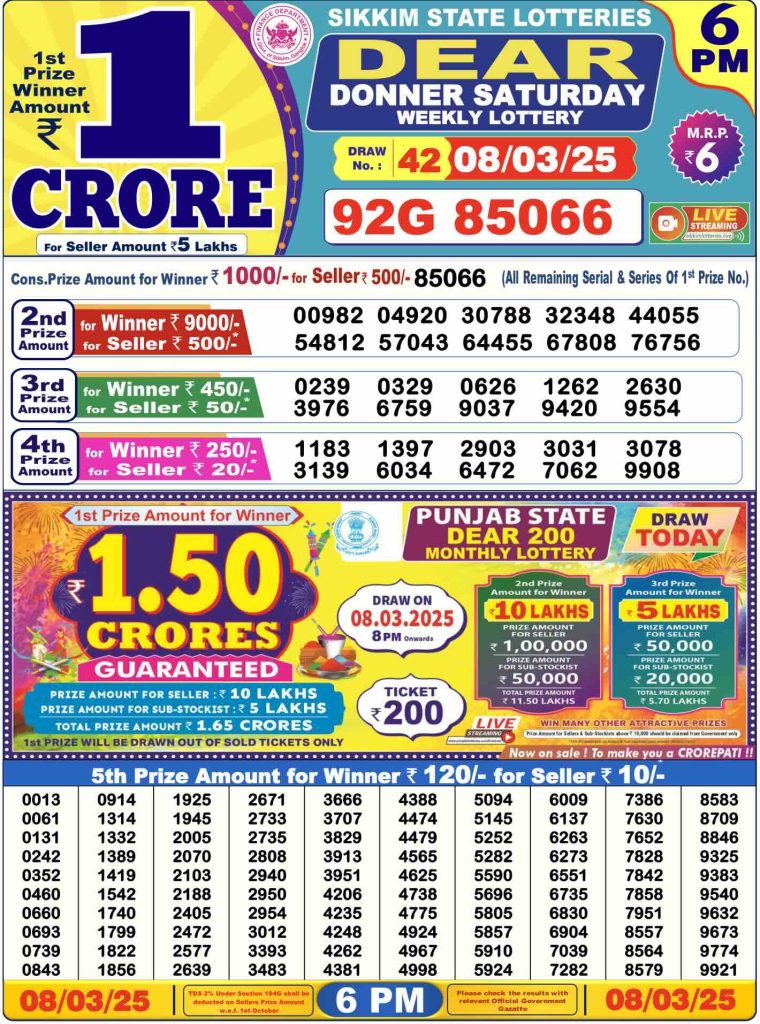 Dear Lottery Sambad Today Result 6 PM