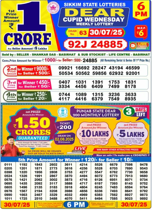 लॉटरी सांबद परिणाम 30.7.2025 दोपहर 1 बजे सुबह का परिणाम, शाम 6 बजे दिन का परिणाम और रात 8 बजे शाम का परिणाम देखें और मुफ्त डाउनलोड करें