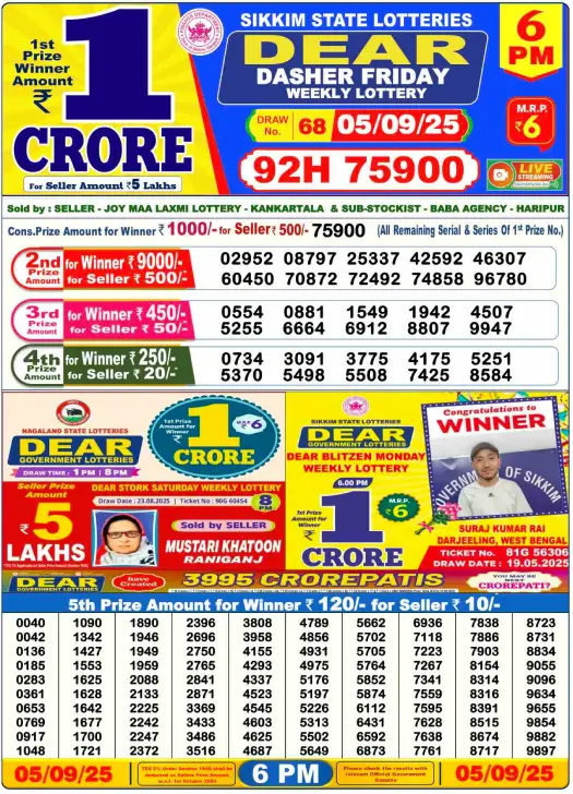 Lottery Sambad Result 5.9.2025 Today 1 PM, 6 PM & 8 PM