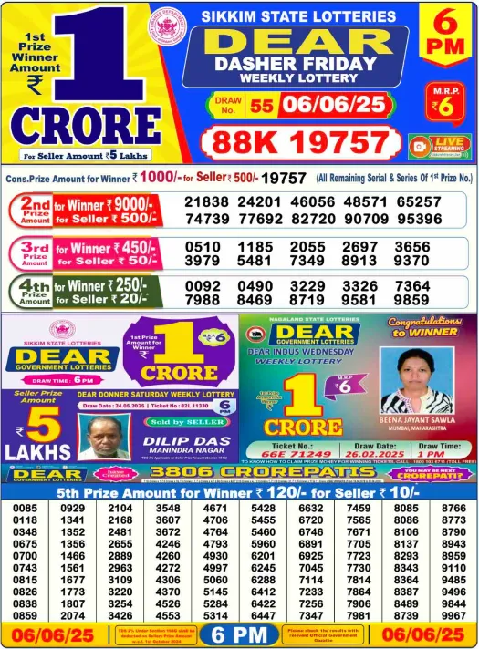 Dear Lottery Sambad Today Result 6 PM